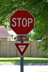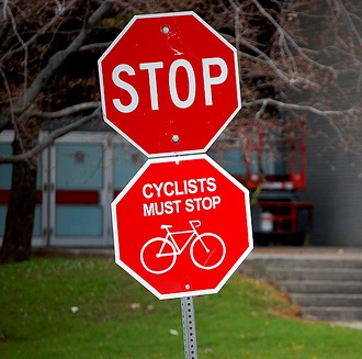 Even a strong cyclist can only produce about 100 watts of steady power to propel herself on a bicycle. (A motor vehicle can produce 100,000 watts.) And stopping and starting at frequent stop signs wastes our precious momentum and squanders the limited power that we have available. That’s why even the most otherwise law-abiding cyclist may break the law a dozen times or more on a long ride by not coming to a complete stop at stop signs.