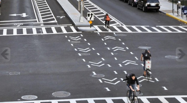 To ameliorate this problem and reduce the number of rights hooks and left crosses, the National Association of City Transportation Officials (NACTO) recommends the use of bicycle pavement markings through an intersection, driveway or ramp. This marking